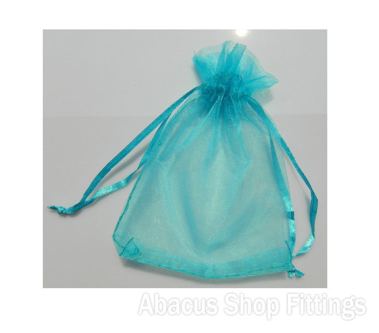 Turquoise organza bags 7x9cm, matching turquoise satin ribbon. Sold in packets of 10.