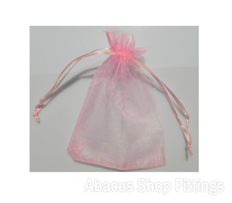 Pink organza bags 7x9cm, matching pink satin ribbon. Sold in packets of 10.