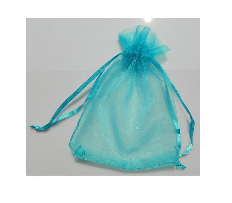 Turquoise organza bags with matching turquoise satin ribbon, 10x15cm Sold in packets of 10